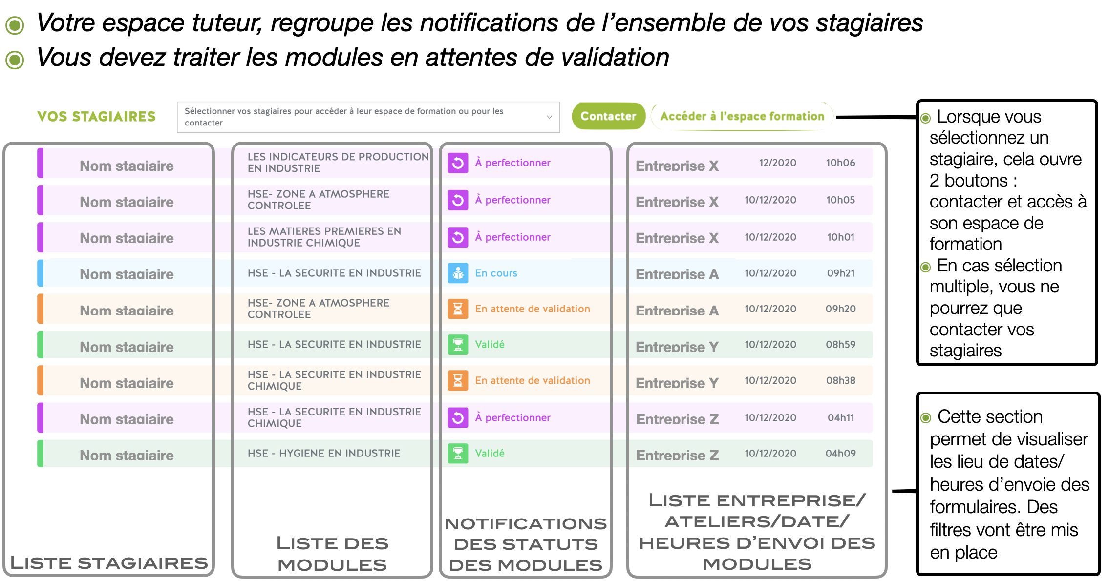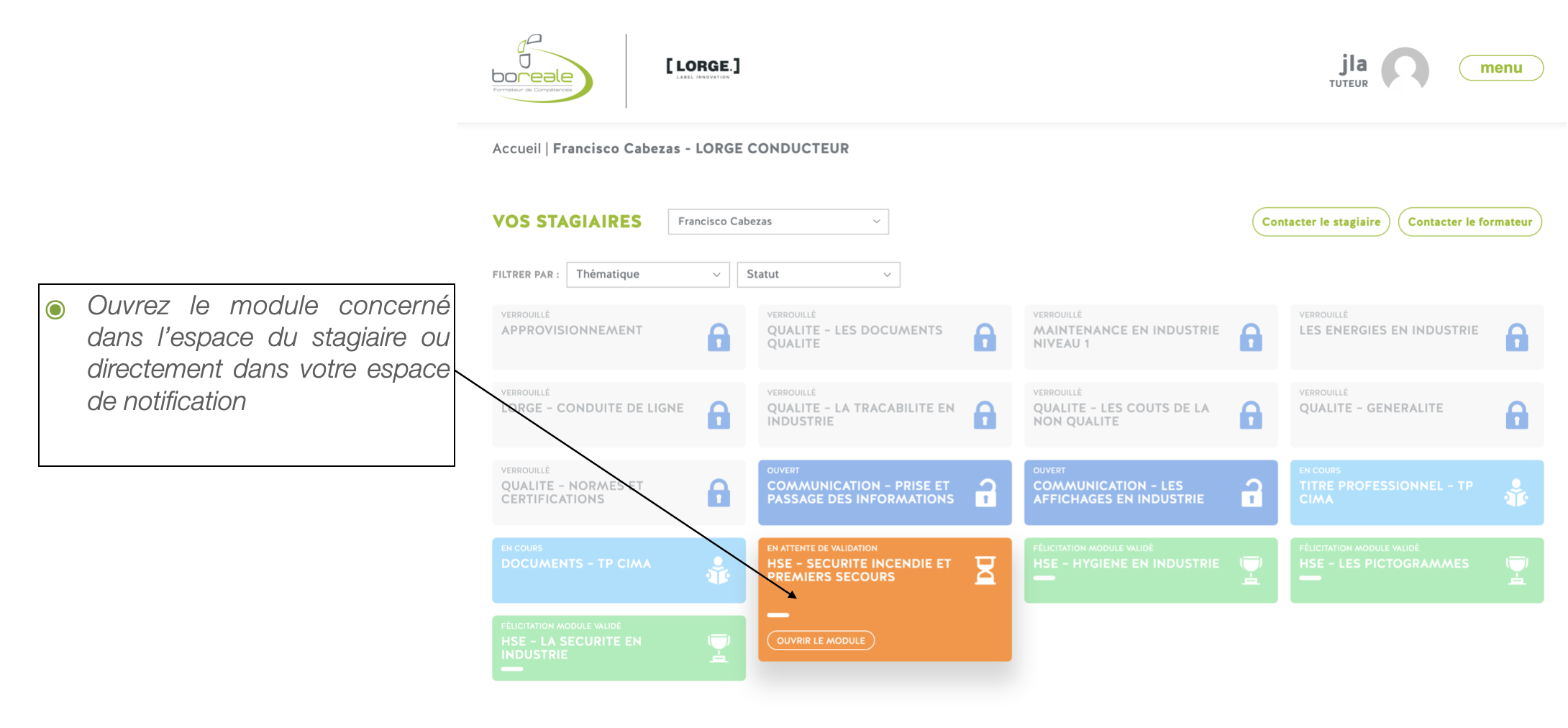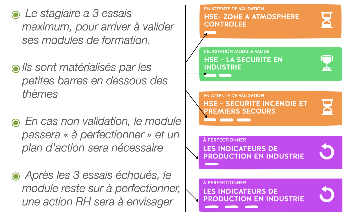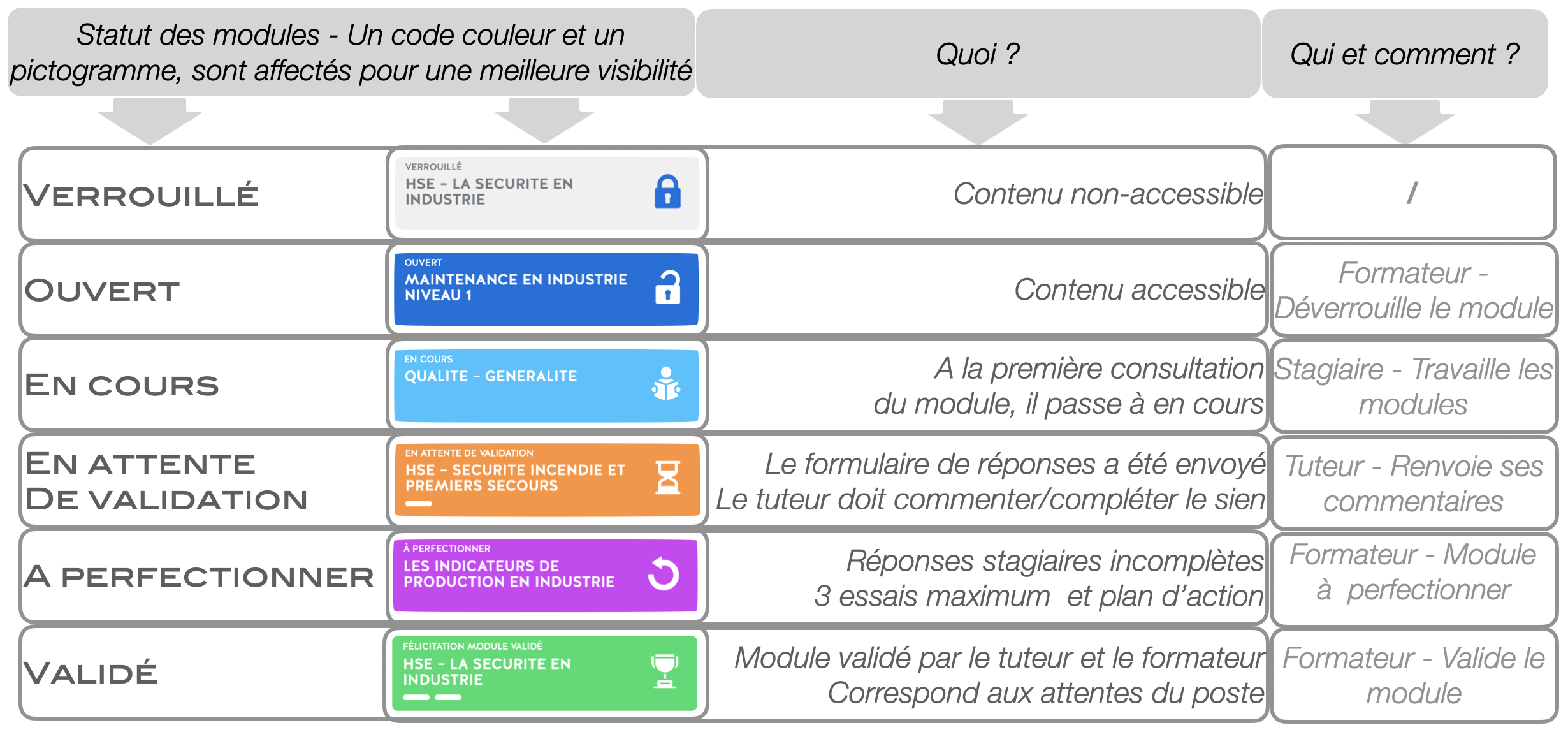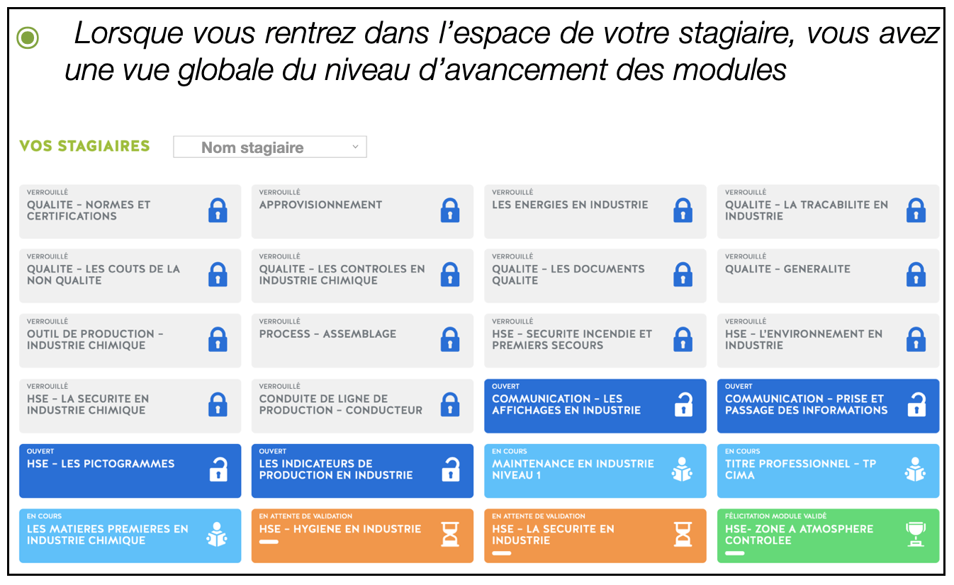 Des statuts définissent l’état d’avancement des modules de formation